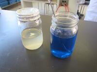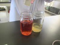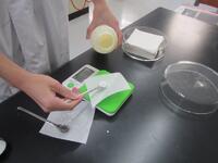 ①塩化カルシウムの計量     ②青の食紅で溶液を染色      ③赤の食紅で溶液を染色