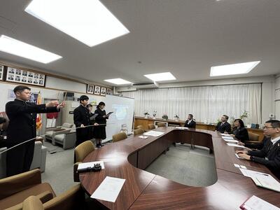 ①大会報告をする両研究部員        ②館林市教育長様と市役所職員の方々も来校